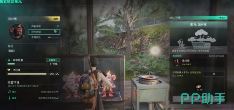 玩家在制造派对猴收容物时需要异常能量值大于30,并且在领地内要有熔炉,发电机等等设备,这样可以有效的提升这个区域内的能量等级。另外在收容环境方面,要放置收音机播放特定的音乐,还需要维持熔炉的高温状态,否则派对猴将会直接休眠。