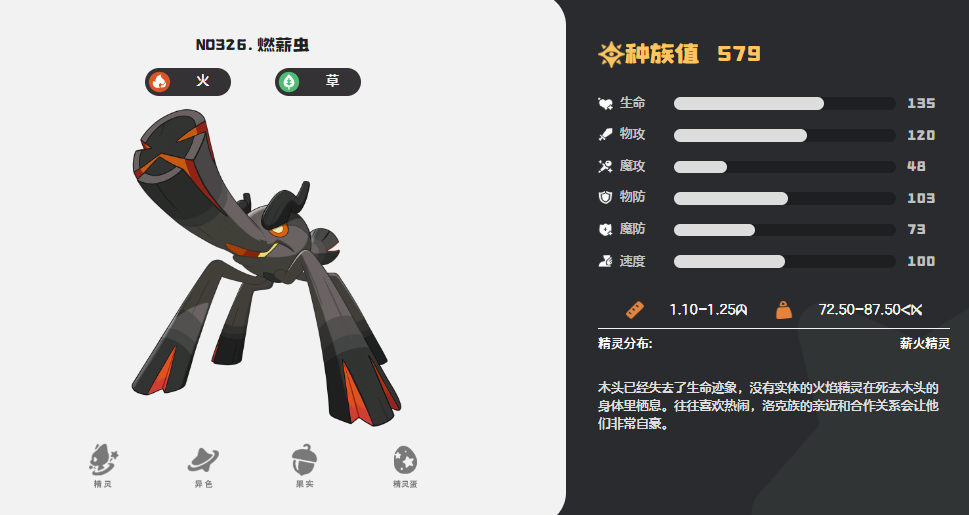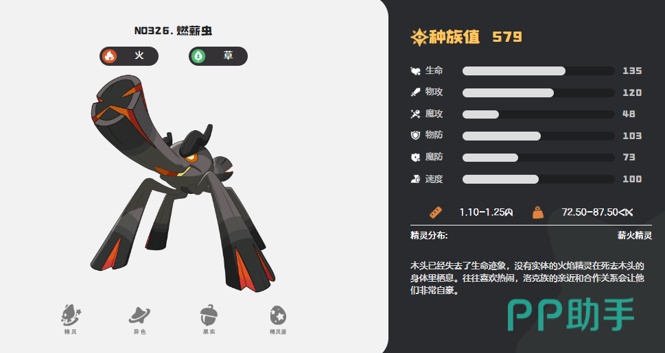 基础属性方面,燃薪虫魔法攻击高达187点,在当前已公开的草火双属性精灵中位居梯队前列;速度值为160点,虽未达顶级敏攻水准,但足以在多数常规输出阵容前完成灼烧铺垫,抢占节奏主动权。