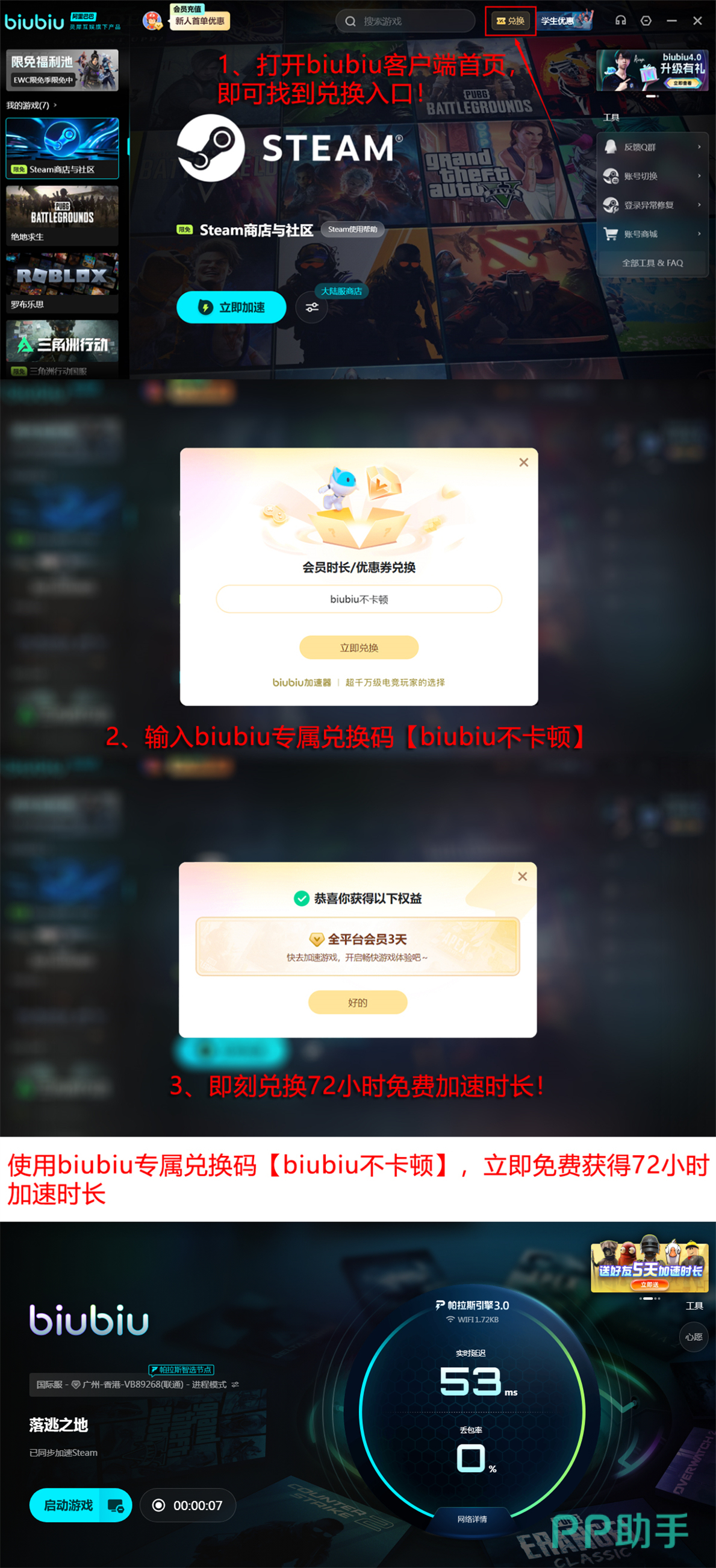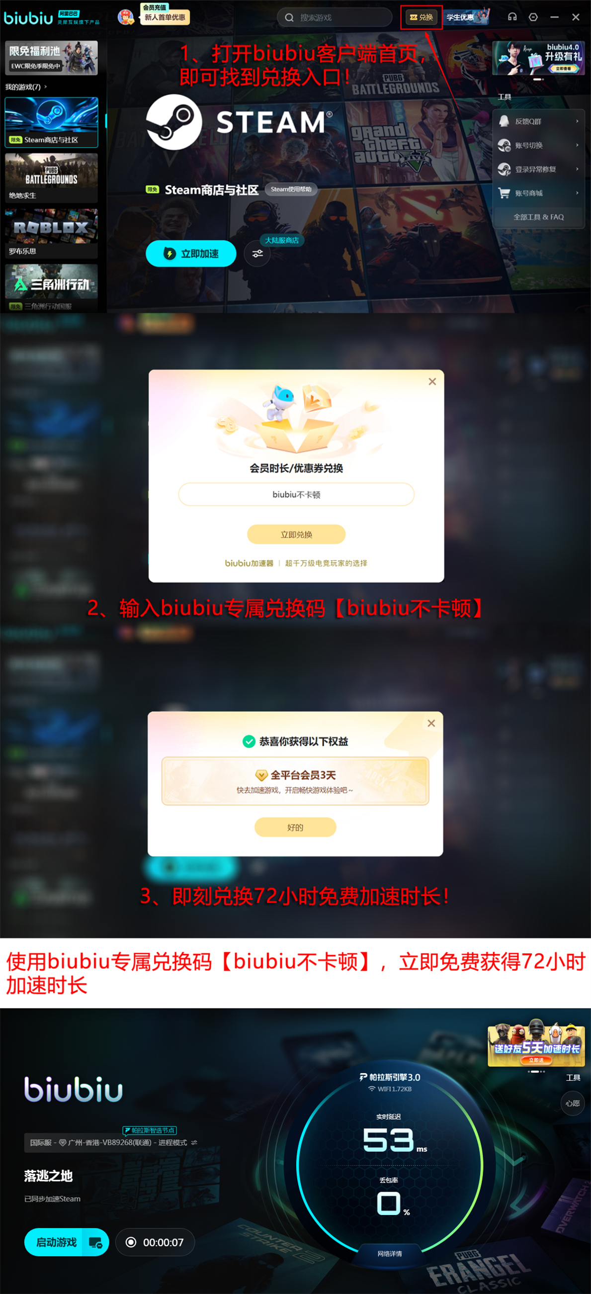 新用户注册后可直接获得24小时免费加速时长;叠加输入兑换码【biubiu不卡顿】,额外获取72小时服务,总计享96小时无门槛加速权益。