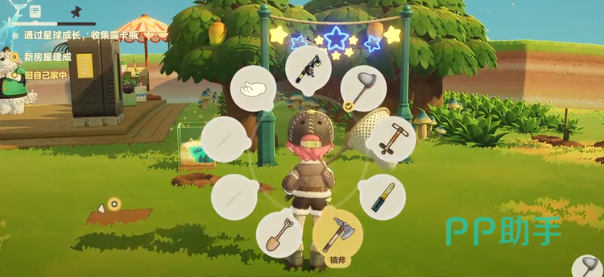 想要顺利使用这把工具,首先要了解如何快速取出。所有基础工具都被收纳在工具环中,只需按住屏幕中央的圆形区域并滑动手指,即可浏览整齐排列的工具图标。其中带有锯齿边缘图案的,便是星布谷地镐斧。初次使用时建议多滑动几次熟悉位置,熟练后便可直接切换至该工具。选中后,屏幕右下角会显示对应的工具标识,表示已成功装备。初期推荐优先选择桦树或杨树进行练习,这类树木树干较细,砍伐耗时短,适合新手掌握节奏。