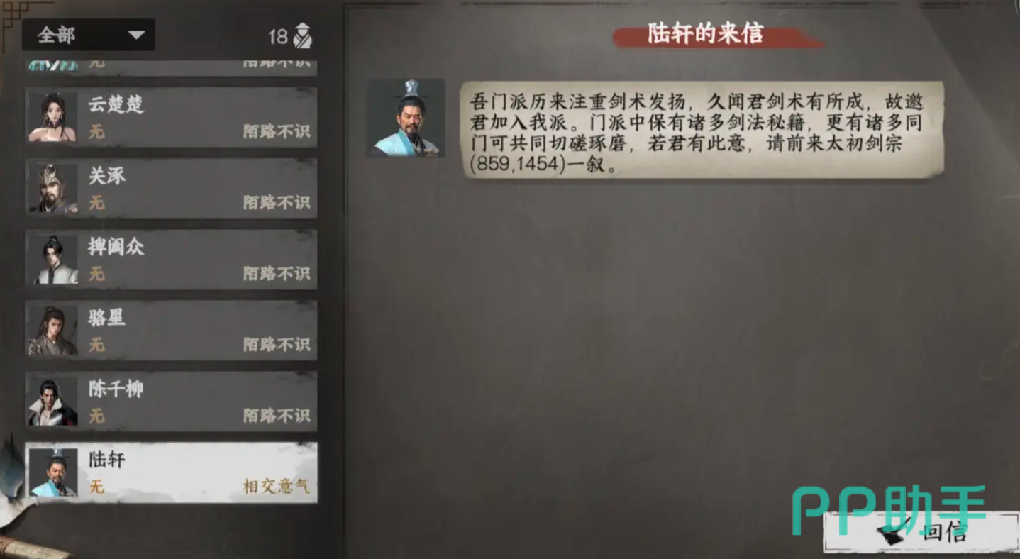 继续通过任务积累好感,当数值达到50时再次收到徐诸通的消息,前去交谈并选择切磋选项,战胜对手后可晋升为关门弟子。待好感升至75,又会接到新的飞鸽传书,返回与其互动并选择“寻物”分支,随后将开启名为“纠葛”的关键任务。成功完成后不仅身份升级为亲传弟子,还能获取一门奇级剑法。此后还会激活“坚守宗门”任务,完成该任务并与季凛对话,最终成为太初剑宗掌门。