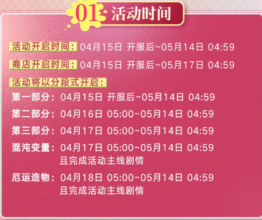 活动周期为4月15日服务器维护完成后起,至5月14日凌晨4点59分正式结束;活动商店则延长开放至5月17日23:59。内容采用分阶段解锁机制:主线剧情第一部分于4月15日同步开放;第二部分开放时间为4月16日05:00;第三部分与「混沌变量」挑战模式均于4月17日05:00上线;而「厄运造物」Boss战则定档4月18日05:00。所有分支玩法需在通关活动主线剧情后方可解锁。