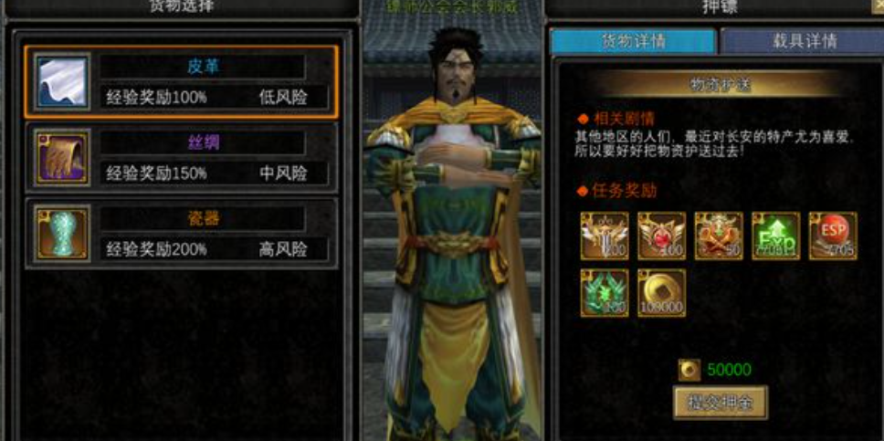 在该游戏当中涉及到单人押镖或者是组队押镖。单人押镖的时候要注意周围的环境,一旦发现有劫镖的人,在这样的情况下,玩家还是要利用地形来做掩护。而组队押镖的话,需要跟队友分工合作,安排近战职业前排吸引火力,远距离作战的职业后排输出,彼此之间要合理的沟通,并且要根据敌人的具体情况,选择合适的策略战术,建议在组队时要灵活。