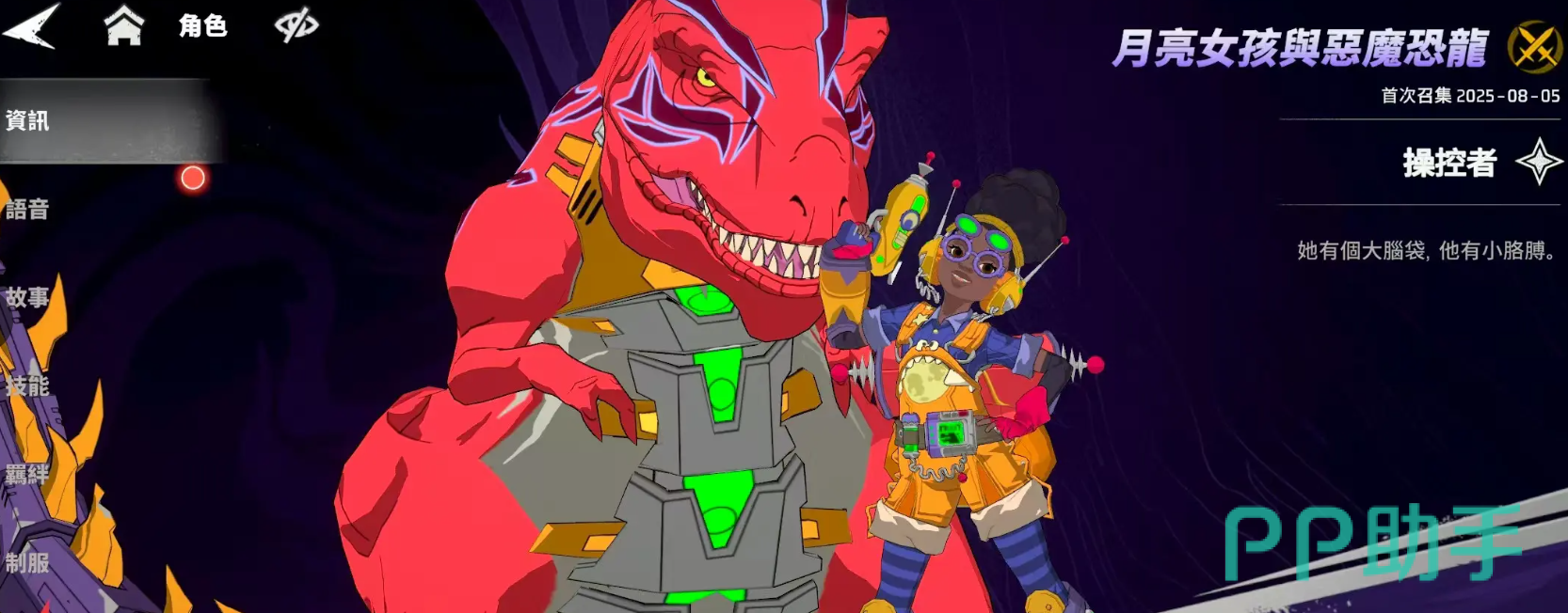 “巨尾横扫”可在大范围造成高额物理输出,并使区域内敌人陷入3秒眩晕,具备优秀控场能力。被动技能在战斗开始时自动召唤恶魔恐龙参战,该单位属性与月亮女孩本体同步。若恐龙被击败,主角将激活特殊战技“欧米波”;反之,若主角阵亡,则恐龙攻速翻倍,但每秒损失10%生命值。“恐龙恐怖”使邻近恐龙的敌人降低10%攻击力,终结技则对目标区域造成大量物理伤害,适合收割残局。