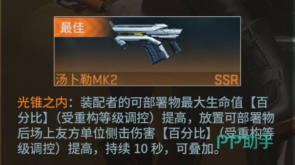 在实战测试中,汤卜勒MK2被验证为最适合的武器之一。其核心优势在于通过重构等级提升角色最大生命值百分比,从而增强所部署掩体与器械的生存能力,避免落地即被摧毁的情况发生。此外,每次成功部署后,还能为场上所有我方单位叠加侧击伤害加成,显著提高整体输出效率。无论是配合狙击手还是突击单位,都能快速形成强力爆发。