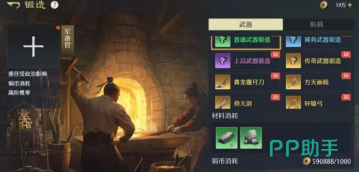 铁匠铺是装备系统的起点,需玩家角色等级达到7级后,在主城内建造解锁。该建筑承担全部装备锻造功能,但所有打造行为均受图纸约束——无图纸则无法启动任何装备制作流程。图纸按品质划分为四档:绿色(普通)、蓝色(稀有)、紫色(上品)、橙色(传奇),品质越高,成品装备的基础属性与附加效果越强,对武将整体战力的提升幅度也越显著。