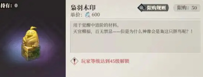 玩家可以在商店的珍惜材料板块中,使用珍贵的苍岩石来兑换枭羽木印,其单价设定为2000一枚,且最多能够换取50个,可别小瞧了这寥寥几个兑换名额,当玩家辛苦将武将觉醒至前面十二段之后,枭羽木印就成了突破瓶颈、迈向无双品级的关键道具。