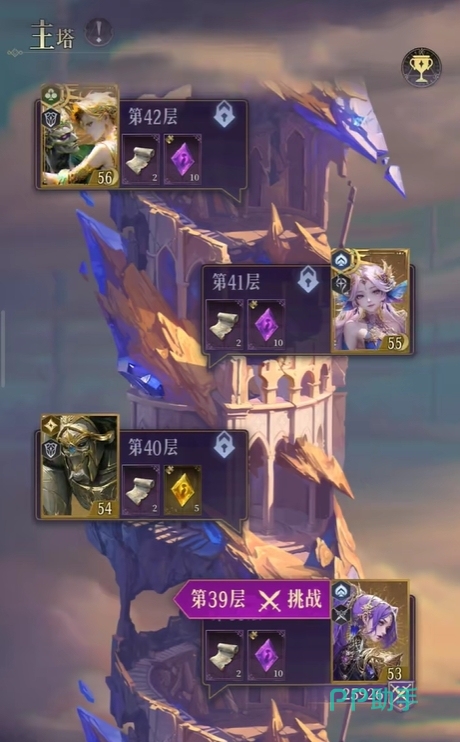 通天塔位于旷野界面内,需解锁旷野功能后方可进入。每一层都有敌人驻守,整体难度逐层递增,且每十层会出现显著的强度跃升。完成当前层数后,系统会提前展示下一层敌方阵容的战力信息,便于玩家评估自身实力是否足以通关。每成功通过一层即可领取对应奖励,其中层数尾数为0或5的关卡将掉落金品角色碎片,集齐指定数量后可随机合成一名金品英雄;其余层数则主要提供紫品碎片,可用于随机兑换紫阶角色。