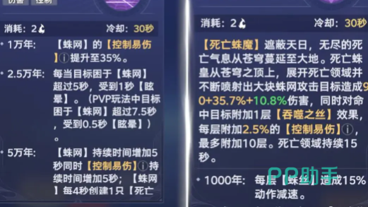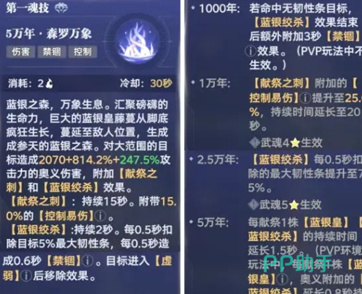 二技能【蓝银绞杀】是阿银聚怪控场的核心枢纽,基础禁锢时长为2秒;升至黄五星后,在【蓝银皇】加持下可延展至5秒;红二星起,即便处于献祭状态,仍能维持可观控制窗口。该技能支持2–3层充能,开场即可连续释放两次,高效弥补单次聚怪范围局限。需注意:PVP中连续施放存在15秒冷却间隔。被动能力构成其强度底层逻辑——3/5阶被动可在战斗开始时生成三株蓝银皇,领域内全体友方获得5%控制易伤加成。配装推荐以4万妖+两蛛皇为主轴,兼顾破刃速度与增伤稳定性。