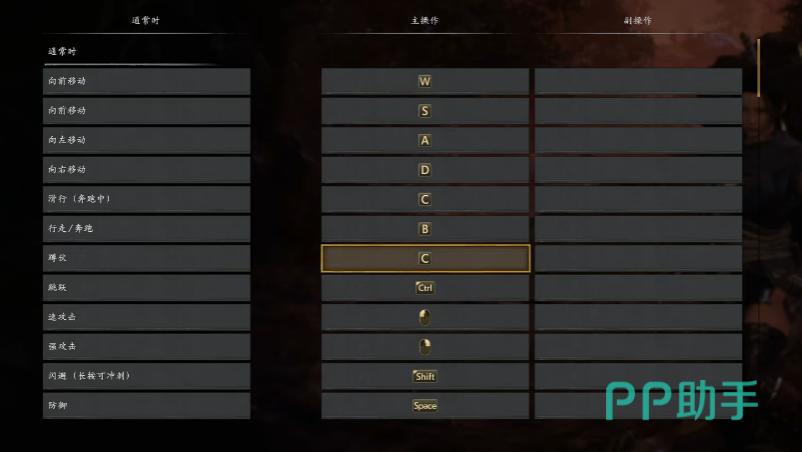 本方案以移动键(WASD)保持默认为前提,将蹲伏与滑行统一绑定至C键:静止或行走时按C实现蹲伏,奔跑中按C则触发滑行动作,符合动作触发的上下文逻辑。奔跑/行走切换交由B键控制,跳跃改设为左Ctrl键,释放双手对鼠标区域的依赖。基础攻击分配延续常规设定——鼠标左键为速攻、右键为重击;闪避采用Shift长按实现冲刺,空格键专用于防御;流派切换则通过鼠标滚轮完成,避免频繁按键切换打断连招节奏。