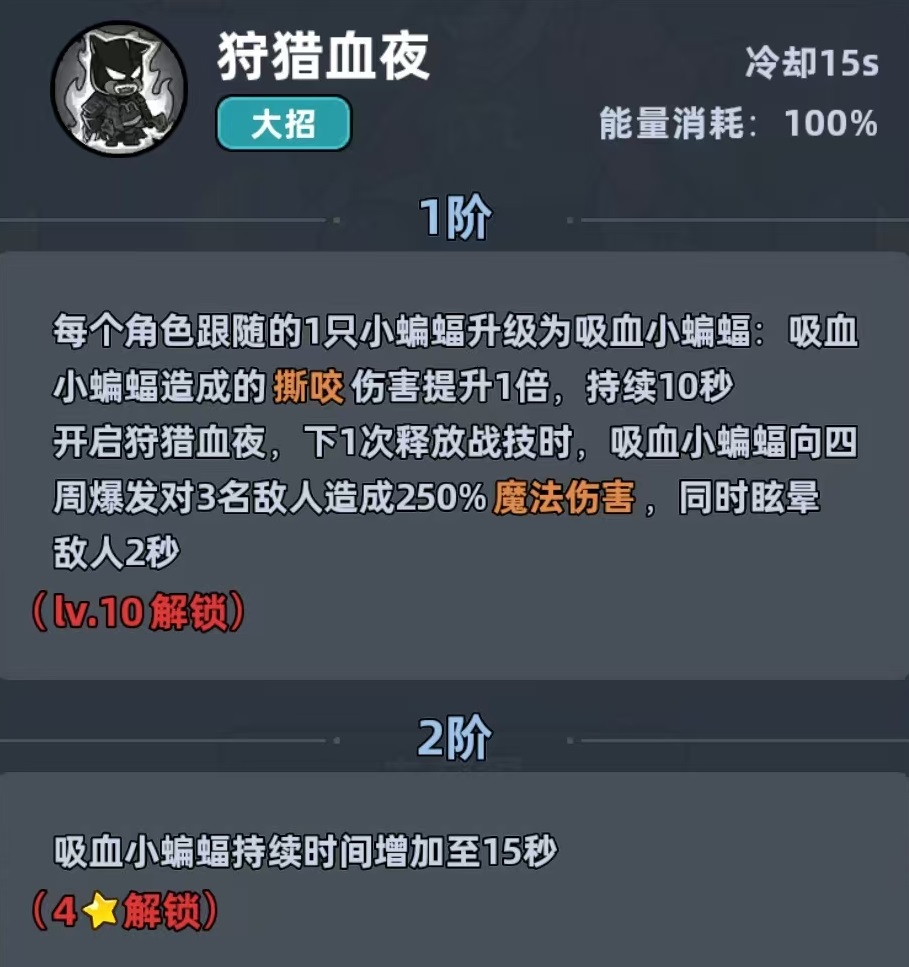 终极技能效果为:所有随行蝙蝠升阶为吸血蝙蝠,单次撕咬伤害提高,并在下一次战技释放时向周围区域爆发,造成范围魔法伤害并附加眩晕效果。该角色本质定位为魔法队功能性副C,兼具增伤、回能、持续回血与群体控场能力,与忍术大师等高频率施法主C协同性极强。属性培养优先级明确:魔法伤害>攻击>技能极速,需围绕技能联动效率与增益覆盖率进行资源倾斜。