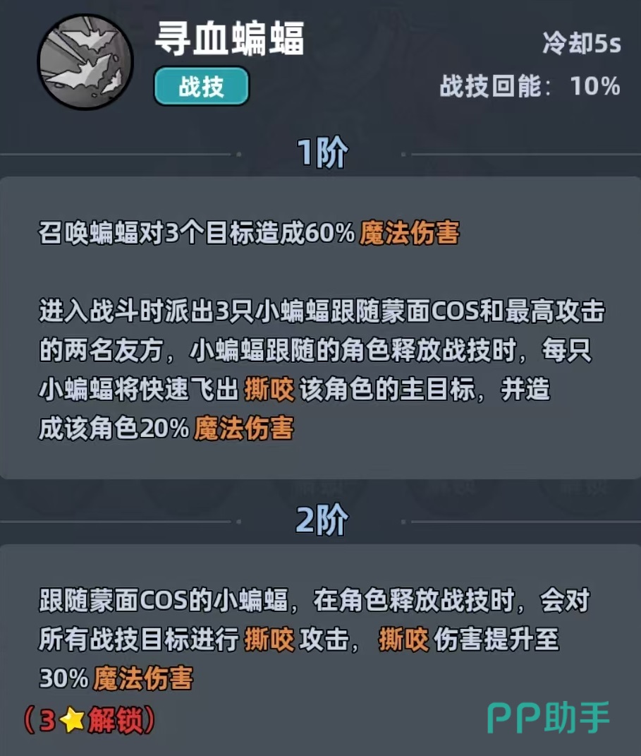 蒙面COS为神话品质远程法师,绑定魔法系羁绊。基础特性包含:全类型伤害提升25%,额外附加10%魔法伤害加成。主动技能【寻血蝙蝠】可对至多三名敌人施放魔法伤害;进入战斗时,自动部署三只追踪型小蝙蝠——分别跟随自身及场上攻击力最高的两名友方单位;当目标角色释放战技时,对应蝙蝠同步发动撕咬,造成额外魔法伤害。