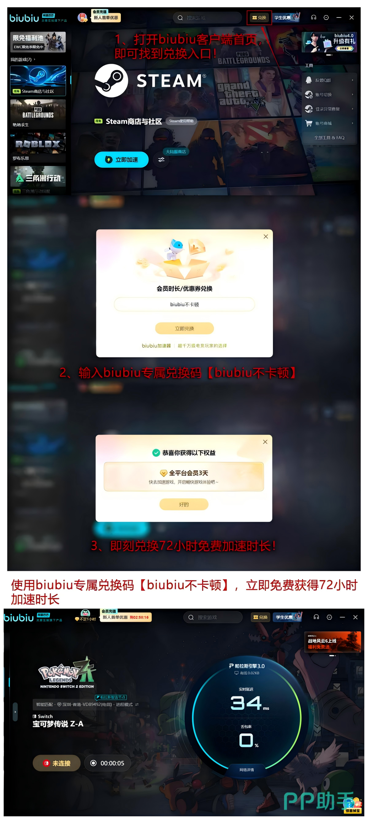 在【兑换】页面输入口令【biubiu不卡顿】即可领取3天免费加速服务,同时新用户还可额外获赠24小时使用时长,累计享受96小时无负担高速连接体验。开启后台挂机加速功能,实现零延迟响应,帮助玩家高效参与限时活动,快速获取净化材料及其他稀有奖励,全面提升游戏体验。