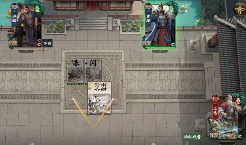 第29关:本关选用左慈出战。起手装备青龙偃月刀并对曹操发动一次【杀】,触发其技能【掷杯戏曹】,诱使许褚交出【闪】进行格挡。重复相同操作再次对许褚使用【杀】,骗掉曹操手中的【闪】。最后释放【箭雨齐射】,在无防御干扰的情况下同时消灭两名敌人,实现稳定通关。