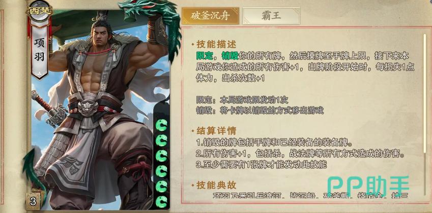 项羽的限定技名为“破釜沉舟”,整局游戏仅可发动一次。发动时需弃置全部手牌及已装备的装备牌(含防具、坐骑、宝物等),随后摸牌至当前手牌上限。该技能生效后,本局内项羽通过任何方式造成的伤害(包括【杀】、锦囊牌、技能联动等)均+1点;此外,在出牌阶段开始时,每减少1点体力,其本回合可使用的【杀】次数+1。值得注意的是,该技能发动前提为至少持有1张牌,且弃牌阶段不可规避此销毁效果。
