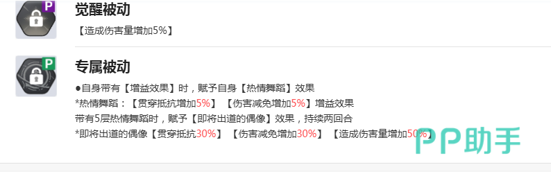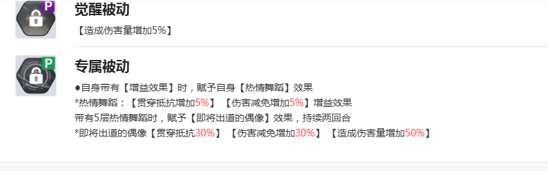 必杀技“激流之舞”拥有高达165%的基础倍率,并且命中稳定性极高——每拥有一层增益状态,命中率便提升15%,几乎杜绝了落空风险。若能叠满三层增益再释放此技能,总伤害将实现质的飞跃,真正实现一击制敌的效果。被动方面,觉醒被动提供5%的伤害加成;专属被动“热情舞蹈”则允许角色在每回合自动叠加层数,每层提供5%贯穿抵抗与5%伤害减免,进一步增强生存与输出能力。