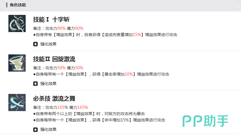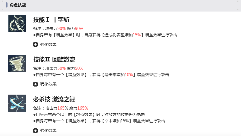 其第一个技能“十字斩”的基础倍率为90%,当角色处于增益状态下,可额外提升15%的伤害输出,相当于自带小型强化状态,在持续作战中效果显著。