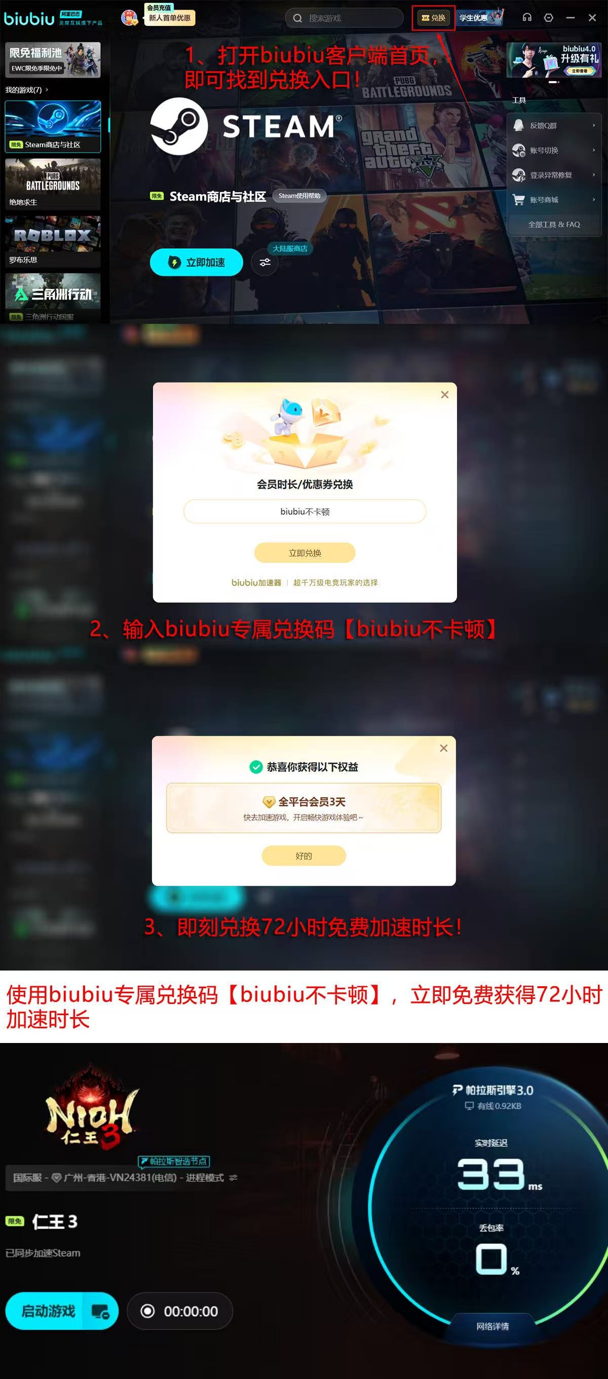 新用户注册后即可领取24小时全功能试用权限,用于测试加速效果;若需延长体验周期,输入激活码【biubiu不卡顿】,可额外获赠72小时服务时长,总计达96小时。