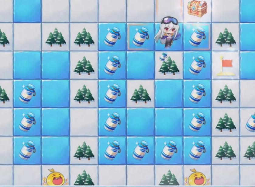 随后上行至顶部区域,向左抵达钥匙点位并拾取。此时不重置关卡,而是原地返回起点——注意此操作为路径回溯,非界面重载。回到初始位置后,全程右移直达首个宝箱并开启。接着右移一格,向下贯穿整列,第三次遭遇史莱姆时仍执行驱离。下行一格后左移到底,拾取第二把钥匙。继续上行,沿途收集全部牛奶道具,坚持左行避让史莱姆,顶端折返后从右侧迂回下行,左移一格避开史莱姆,最终抵达底层宝箱完成开启。