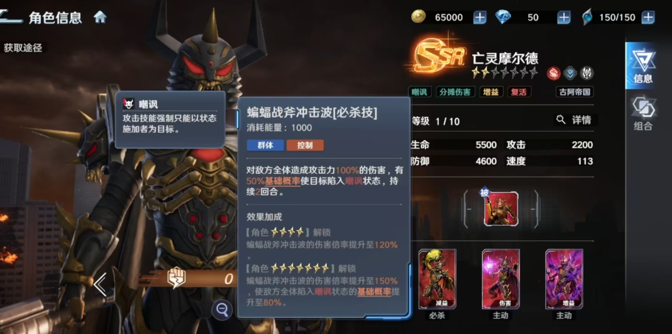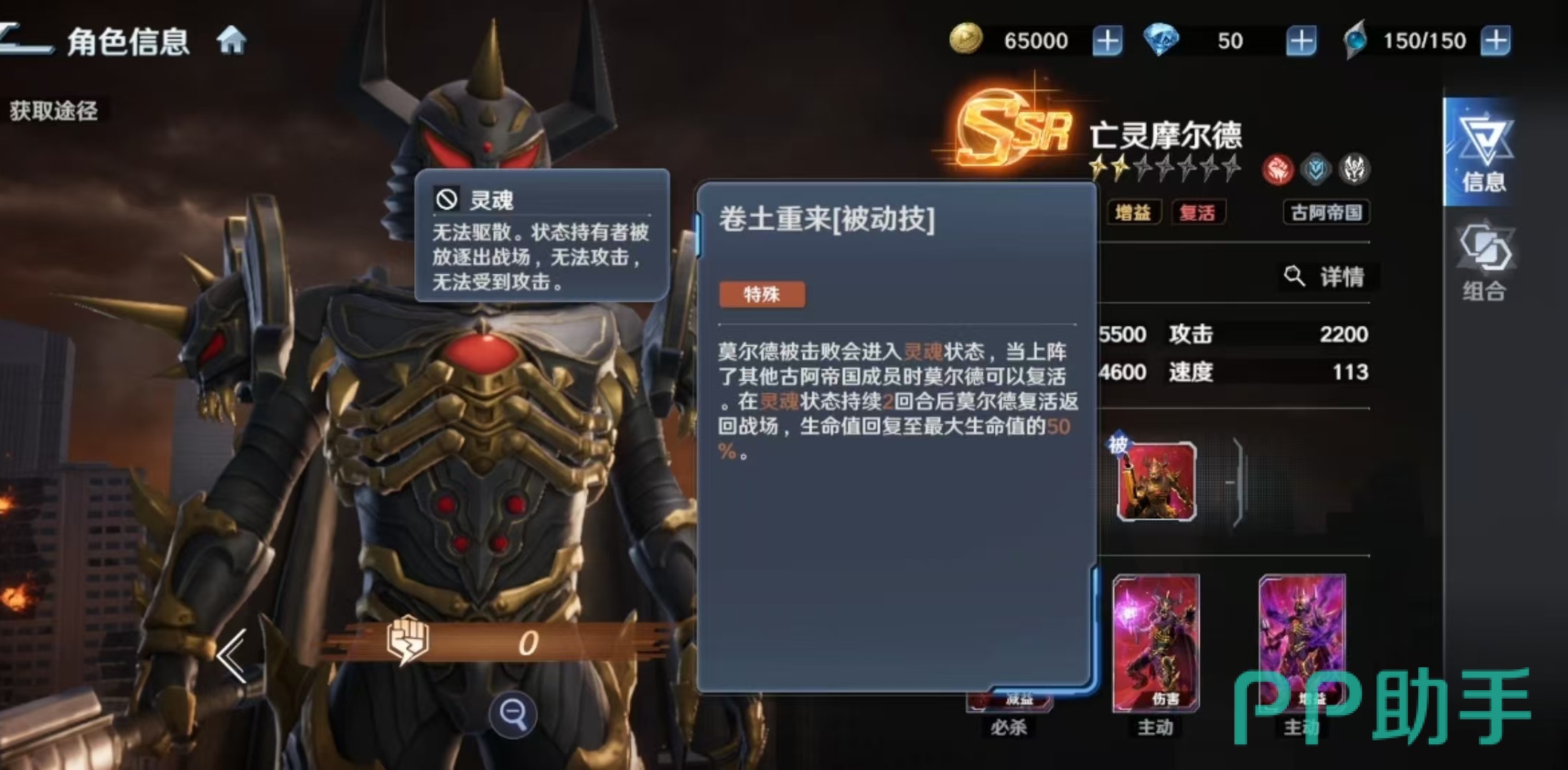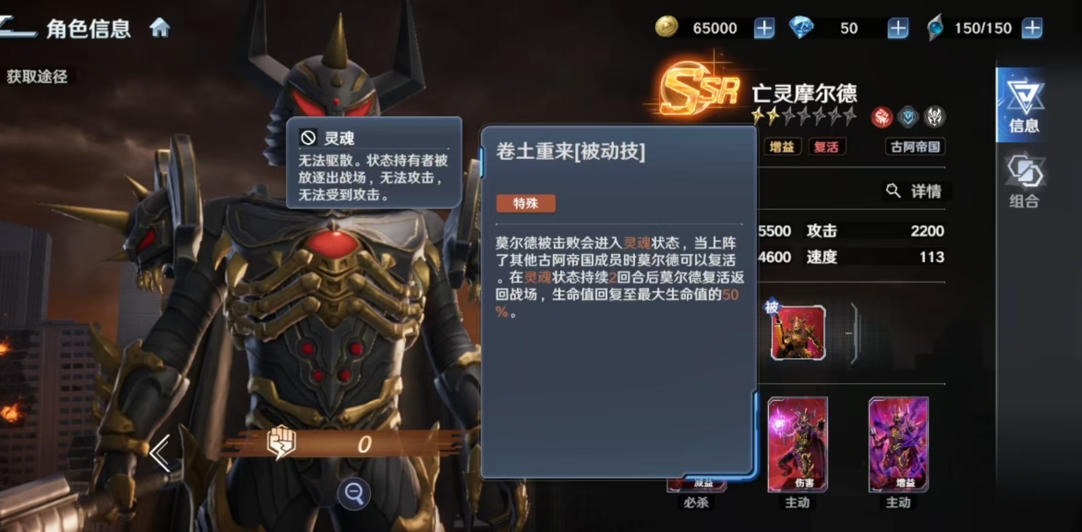 亡灵摩尔德定位为团队承伤与战术枢纽角色,核心机制围绕“嘲讽”“伤害分摊”及“条件复活”展开。其被动技能【卷土重来】规定:当摩尔德被击倒时,若场上存在至少一名其他古阿帝国阵营单位,则可在两回合后重返战场,并恢复至50%最大生命值。该机制显著提升队伍容错率,但生效前提明确依赖古阿帝国队友协同——因此阵容中必须配置至少一名同阵营角色以激活复活效果。