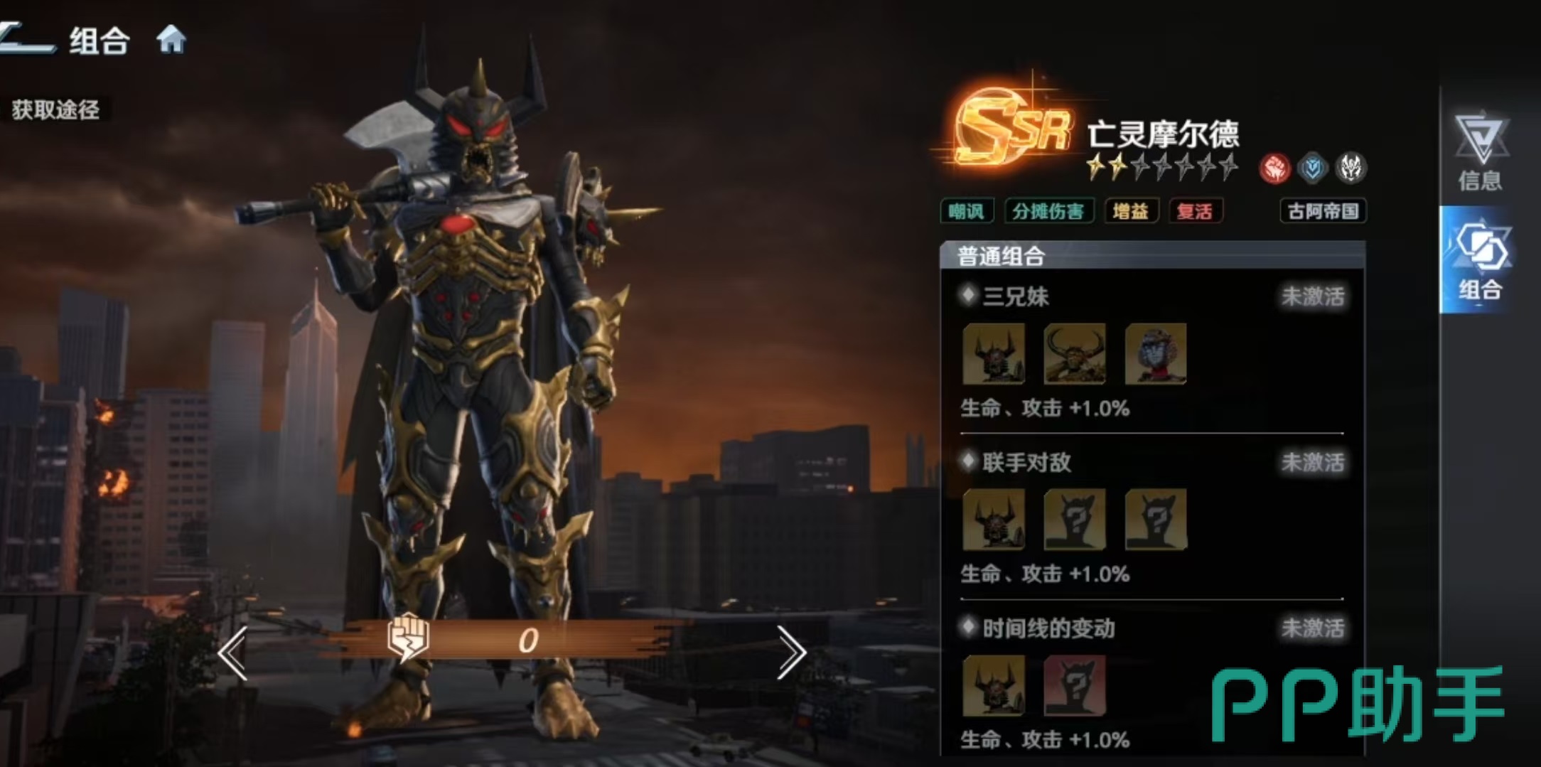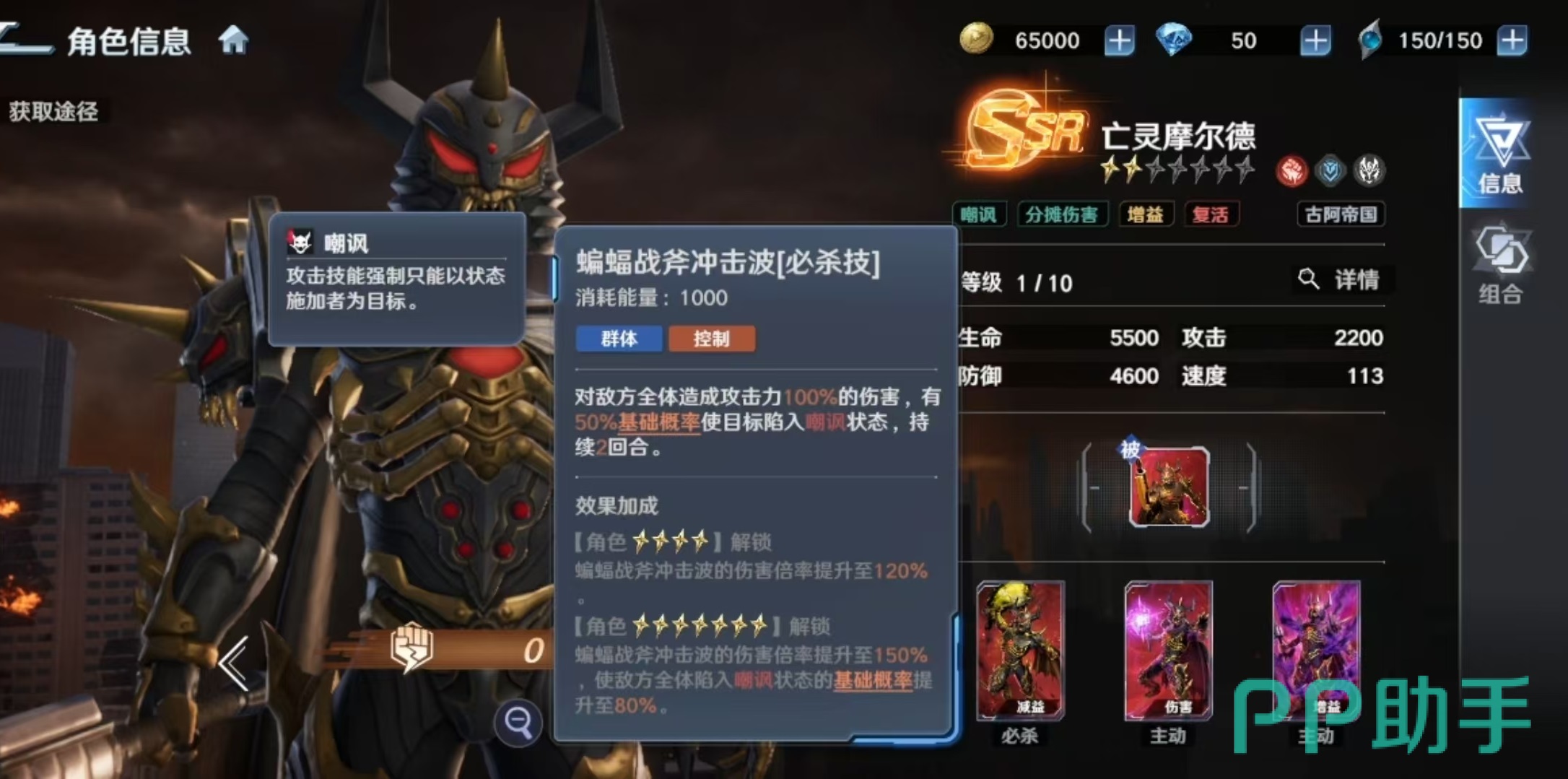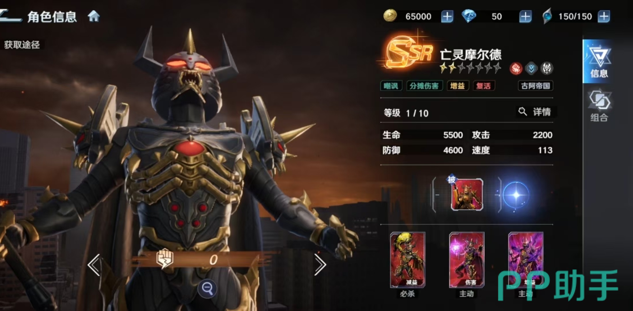 亡灵摩尔德定位为团队承伤与战术枢纽角色,核心机制围绕“嘲讽”“伤害分摊”及“条件复活”展开。其被动技能【卷土重来】规定:当摩尔德被击倒时,若场上存在至少一名其他古阿帝国阵营单位,则可在两回合后重返战场,并恢复至50%最大生命值。该机制显著提升队伍容错率,但生效前提明确依赖古阿帝国队友协同——因此阵容中必须配置至少一名同阵营角色以激活复活效果。