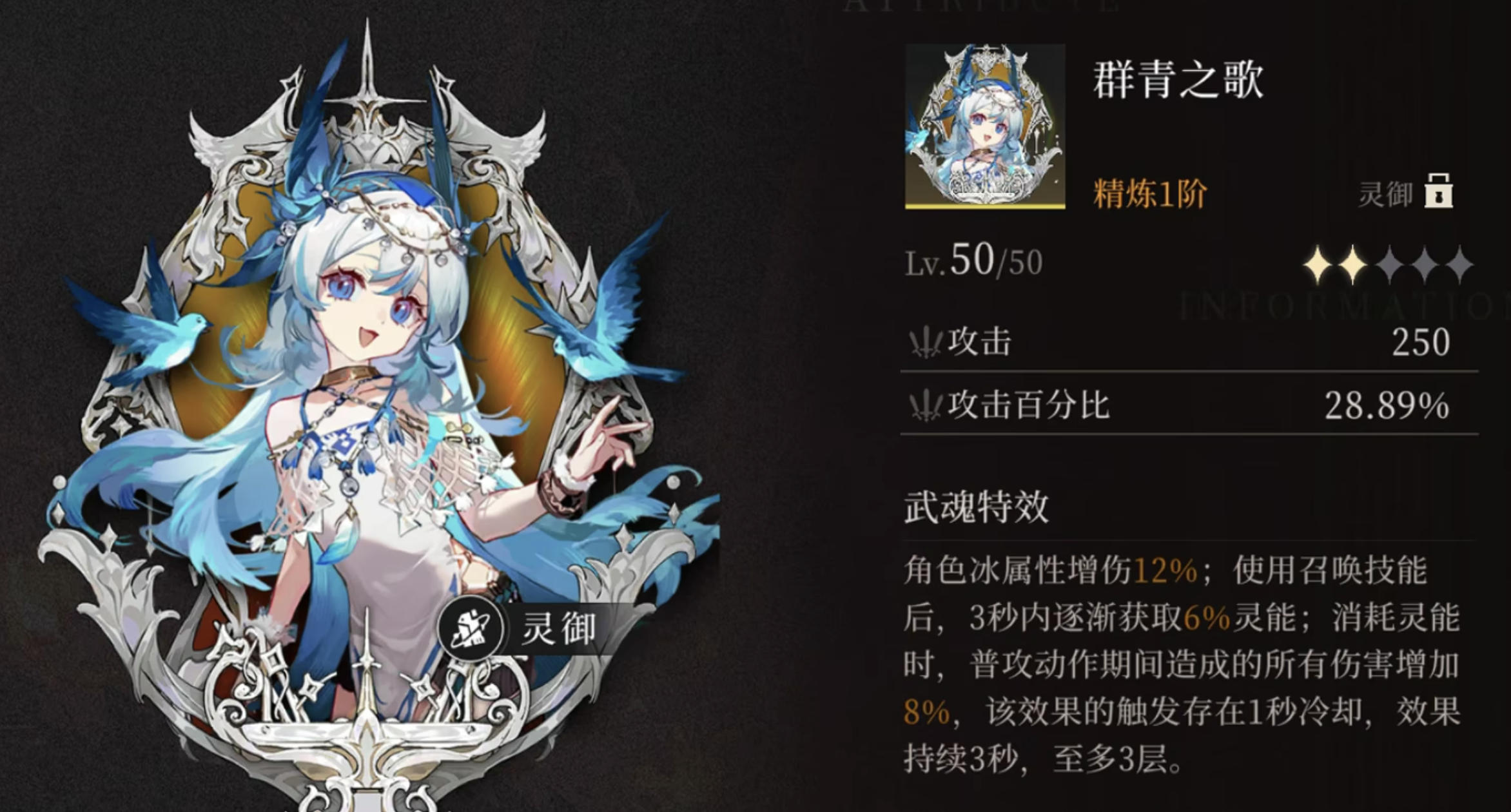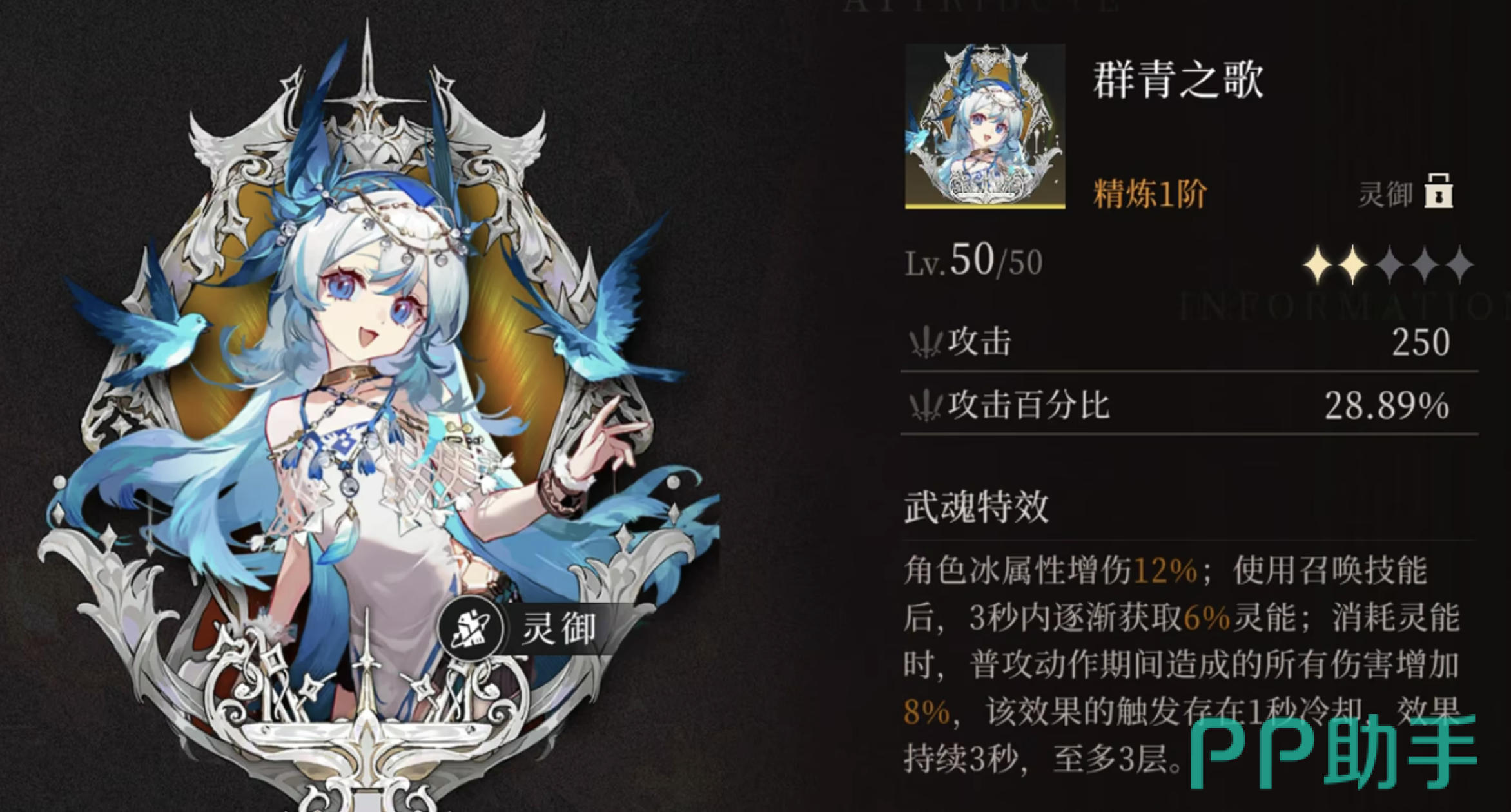 伊莱莎拥有专属武魂“群青之歌”。该武魂看似仅提升普通攻击期间的伤害,实际应用中却极为强势。因伊莱莎能同时操控自身与龙协同作战,此加成会同步作用于两个单位,使其在普攻状态下整体输出能力大幅提升。