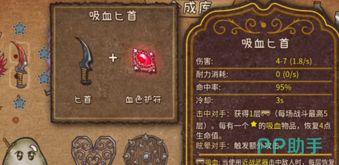 吸血匕首属于近战武器,玩家们在攻击敌人的时候也会获得吸血效果,并且每层恢复一点生命值他拥有额外的攻击效果,可以直接眩晕对手,当玩家们击中对手的时候,会获得一层吸血,在每一场的战斗中可以获得最高5层吸血效果。当玩家们本身拥有吸血物品时会恢复4点生命值,冷却时间只有3秒,命中率高达95%,伤害主要是4点~7点,是个不错的武器。