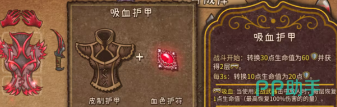 吸血护甲的效果非常突出,在玩家刚开始战斗的时候就可以直接增加30点的生命值,并且获得一个护盾,在初始就获得两层吸血,随着时间的增加,每3秒它就会将10点生命值变成20点的护盾,在防御方面非常可观,它的吸血效果也是和其他武器装备一样,随着攻击获得层数,然后提高生命值,他的品质很高,拥有着传说的品质,在类型方面主要属于护甲。