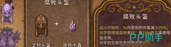 腐败头盔主要的品质是传说型的头盔,它可以对敌方造成减少增益效果,让其的生命恢复效果直接减弱30%,并且它还有15%的几率使对方获得的增益变无效,在对局刚开始时玩家们在前五秒内的受到的攻击会直接减少25%,是一个防御效果和增益效果都非常突出的装备。