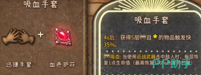 第二个可以合成的物品就是吸血手套,吸血手套需要迅捷手套加上血色护符,在将二者相融之后,玩家们就会获得吸血手套,吸血手套的品质很高,属于神级品质它的类型是属于手套一类,在玩家们获得吸血手套后,它的技能会在每4秒后获得5层吸血,并且会加快玩家们获得低星物品的时间,直接增加了35%,红手套有一个吸血技能,在使用近战的武器对敌人攻击时就会增加层数恢复生命值。