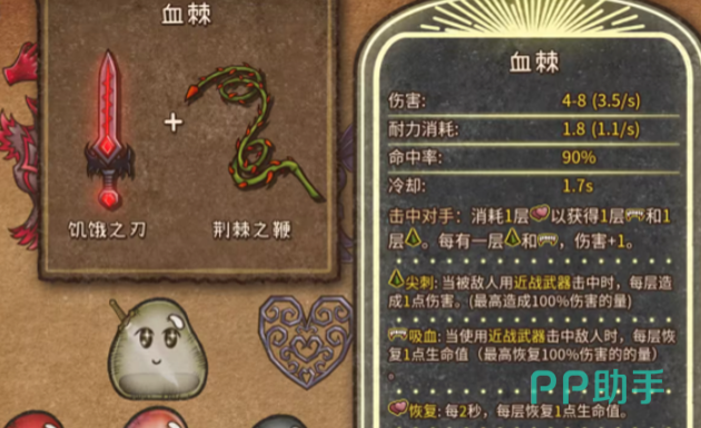 合成的物品会因为合成的步骤不同而得到不同的武器,玩家们将饥饿之刃与荆棘之鞭相融就会得到血棘,血棘可以在对敌方发起攻击时对敌方造成吸血效果,在被敌人击中的时候,会叠加恢复层数,当层数增加时,玩家们会逐渐增加攻击能力,这个能力属于‘尖刺’,而在攻击敌方获得的吸血效果的则是‘吸血’。