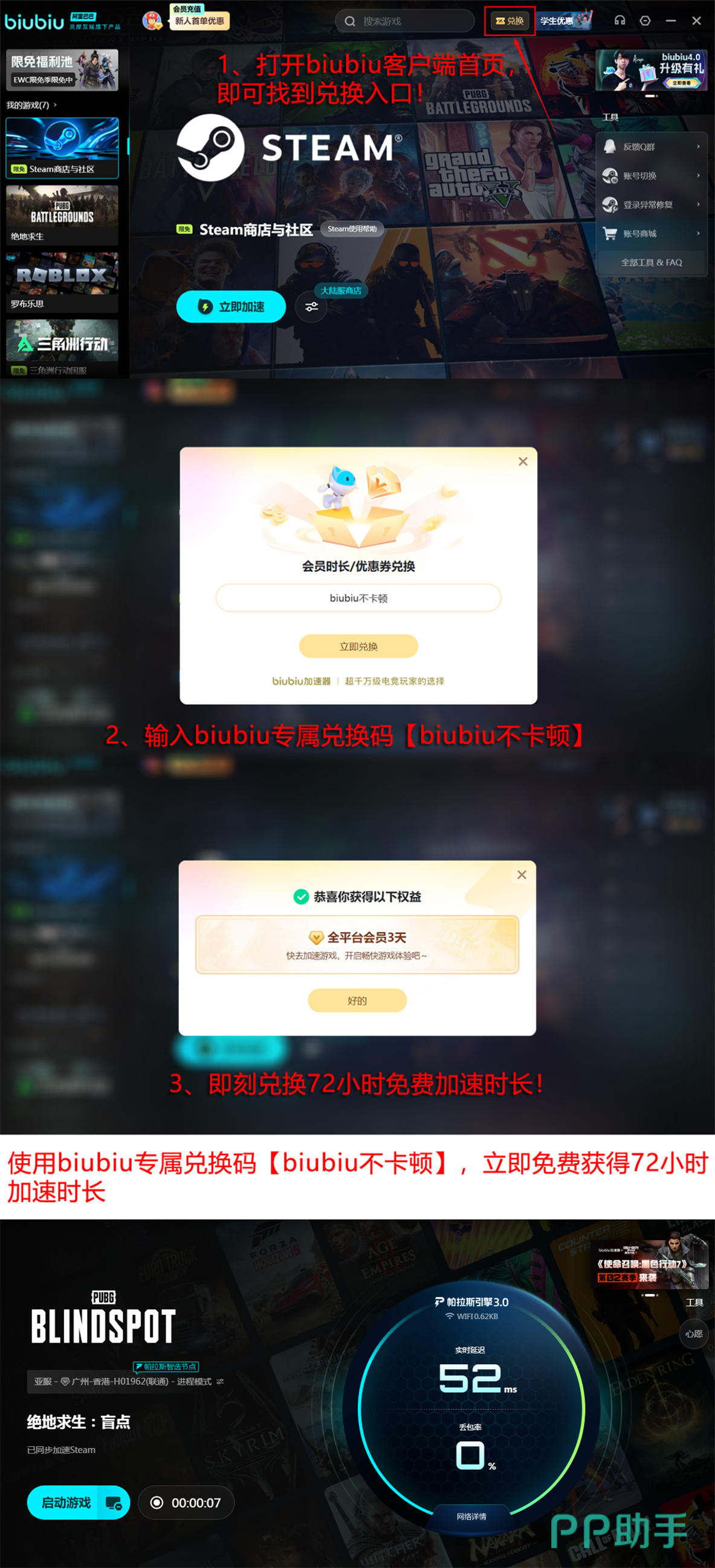 目前biubiu提供新人专属体验通道:可注册一个新号利用新人免费获得24小时加速时间的福利,无需额外操作,注册即启。此外,还有一个兑换码福利,每个号都能输入【biubiu不卡顿】,兑换72小时加速时间。两项叠加,新用户最高可享96小时无门槛加速服务。