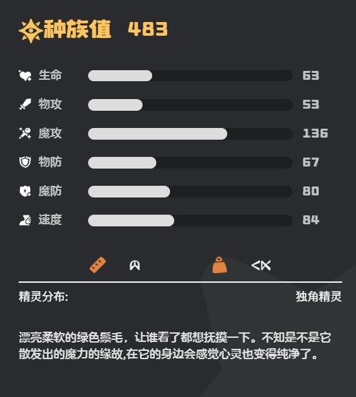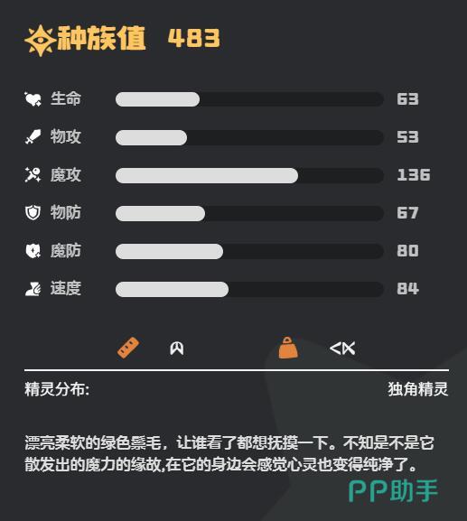 小独角兽魔攻种族值达到136点,位列全游戏魔攻榜第一梯队,速度84点也属于中上水平,适合作为队伍中的法术核心。生命值63点、物防67点、魔防80点的三维属性使其在对抗魔法伤害时表现优异,但需注意规避物理系高爆发敌人。技能搭配也是要注意魔攻或者辅助。小独角兽可以进化为白金独角兽。白金独角兽偏向魔攻,适合魔法输出,强度也同样是非常不错的,颜值也非常高,小编推荐大家必入一只进行培养。