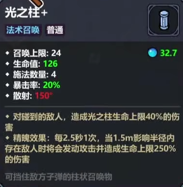 光柱法术的伤害机制基于其自身生命上限的40%,每击中敌人即可造成对应比例的伤害。其精魄强化效果为:在1.5M范围内存在敌方单位时,将触发一次高达生命上限250%的范围伤害,冷却时间为2.5秒。