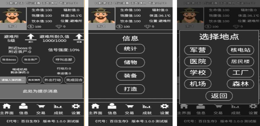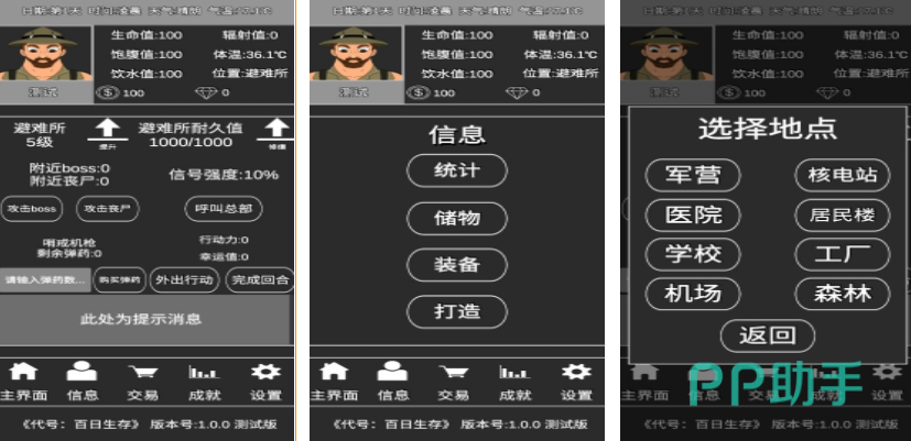 一般的生存游戏,都会设定大量的真实画面,但是代号百日生存,却是一个文字类型的生存游戏,在游戏里玩家可以用文字的方式探索不同的场景,然后在这些场景里选择自己需要的物资,在这个充满辐射的环境中,玩家需要时刻注意自己的各项生命体征,游戏开始之前可以自由分配10点数值,这样会根据玩家选择的体力,敏捷,智力和幸运数值的不同,生成一个专属的生存挑战。