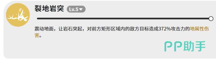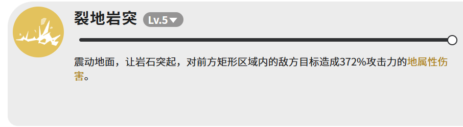 输出技能【裂地岩突】满级可造成372%攻击力的地属性伤害,作用范围为前方矩形区域。虽定位非主C,但该技能具备可观的群攻清场效率,是加杜在保障生存前提下参与节奏压制的重要手段。