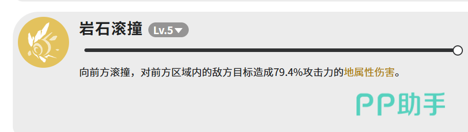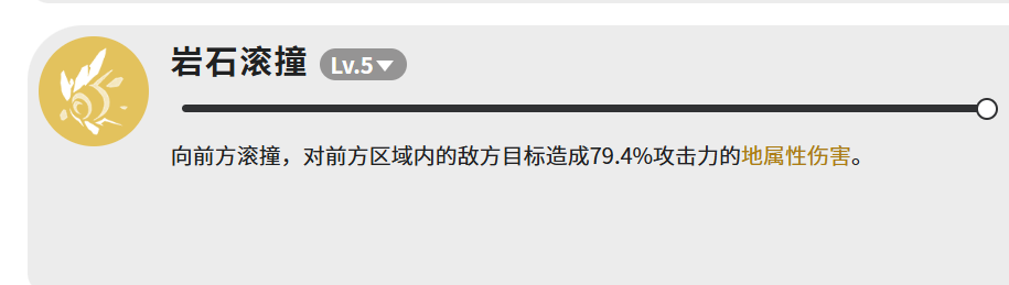 【岩石滚撞】满级伤害为79.4%攻击力的地属性伤害,作用于前方扇形区域,主要承担补刀与衔接控制的功能性输出任务。