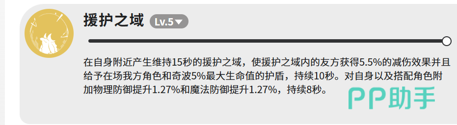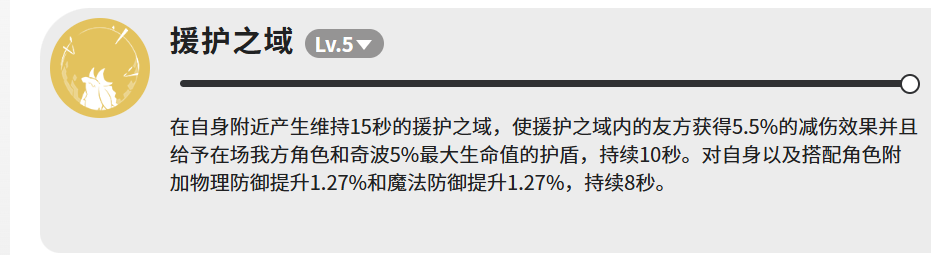 核心技能【援护之域】(满级LV.5)提供三重增益:生成持续15秒的领域,使范围内友方单位获得5.5%减伤;同步为全体我方角色及奇波施加护盾,护盾值为各自最大生命值的5%,持续10秒;此外,加杜自身及协同作战角色还将额外获得1.27%物理防御与1.27%魔法防御提升,持续8秒。该技能不依赖单体承伤,而是通过群体覆盖实现稳定生存增益,尤其适配高血量构筑队伍。