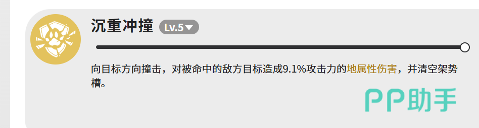 【沉重冲撞】虽仅有9.1%攻击力的伤害倍率,但具备机制级控制效果:命中后强制清空目标架势槽,触发硬直状态。该效果可有效打断敌方技能循环、创造集火窗口,是加杜在Boss战与高难度副本中不可替代的战略支点。