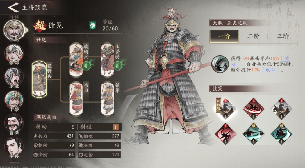 除上述三位主力外,夏侯惇、郭嘉与徐晃也是值得重点培养的角色。夏侯惇为新人玩家初期赠送武将之一,虽基础战力普通,但具备受伤后自动恢复生命值的被动能力,配合奇兵类角色能显著增强团队续航。郭嘉定位为远程输出单位,凭借较长的攻击距离可在后排稳定施加压力。徐晃则擅长在二级战斗阶段打出高额爆发伤害,是远程输出阵容中不可或缺的强力成员。