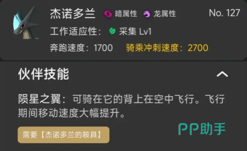 杰诺多兰以均衡性见长:1700奔跑速度与2700基础冲刺速度虽略低于空涡龙,但通过满星伙伴技能可额外获得20%移动速度加成,使实际冲刺表现与空涡龙持平;更关键的是其拥有300点耐力值,为同梯队坐骑的三倍水平,大幅延长持续飞行时间,显著提升地图覆盖效率与任务链执行稳定性。