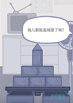 第一关中玩家需要完成一个小城堡的搭建,完成所有的对话之后,拿起积木将画面轻轻向右倾斜,这个时候你会你的父亲正在这里,将手中的积木递给他,父亲便会陪你一起玩耍了,接着进入第二关,这个关卡中母亲会叫你去喝汤,立即丢下手中的游戏去找母亲即可。