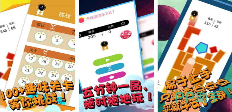 这是款内容极具创新的高休闲性消消乐佳作,采用的也是方块消除的方式以及极简的画风,操作方面很容易尽情消除多边形方块即可,消除方块的速度很快且极具快感值得大家体验,五分钟即可完成消除任务的设定进度更快,百余个有趣的方块消除关卡期待大家完成,多样的方块消除闯关模式让大家越玩越上头。