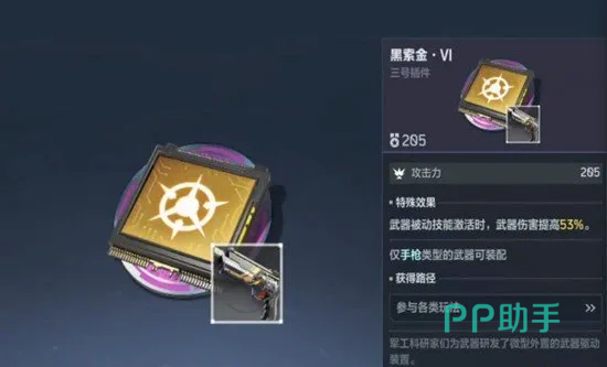 黑索金组件代表该武器的高阶强化方向,专为手枪类装备设计。装配后可激活专属被动效果,使整体伤害提升至53%,属于当前版本中明确标注的固定数值加成。此配置适用于追求极限爆发输出的玩家,在决赛圈或定点伏击等场景中能实现高效秒杀。