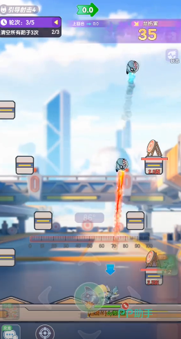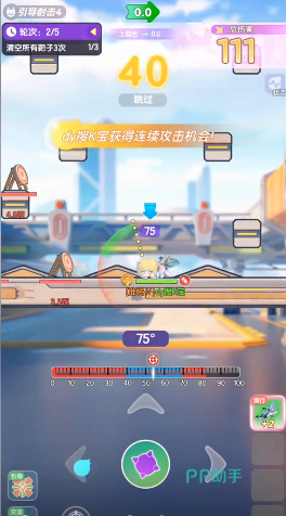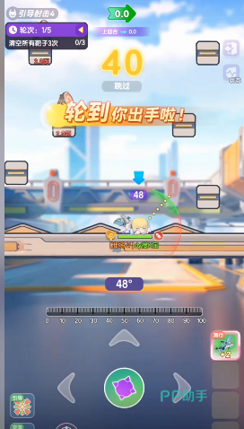第一轮:本阶段为无地形干扰的基础路段,地面平整,无坡道或障碍物影响。此时应快速执行掉头并推进动作。建议直接将发射角度设为最大值,避免逐级调整浪费回合。力度控制在80左右,允许±2范围内的浮动。若力度过高,角色易超出目标区域;若偏低,则难以完成转向与前进。采用最大角度配合80力度,可高效实现角色调头。