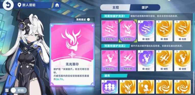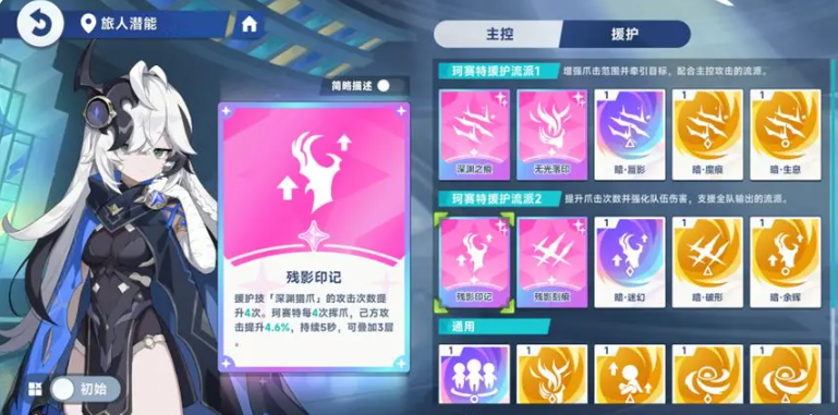 珂塞特的核心优势在于她能够持续施加暗属性易伤效果,配合技能与潜能系统,大幅提升队伍的整体伤害效率。她的援护技能“深渊猎爪”不仅能对目标造成打击,还能叠加残影印记,每层提升4.6%的攻击,最多可叠加三层,总计约12%的攻击加成。该印记持续5秒,合理衔接技能释放节奏即可实现高频覆盖,从而稳定增强团队输出。