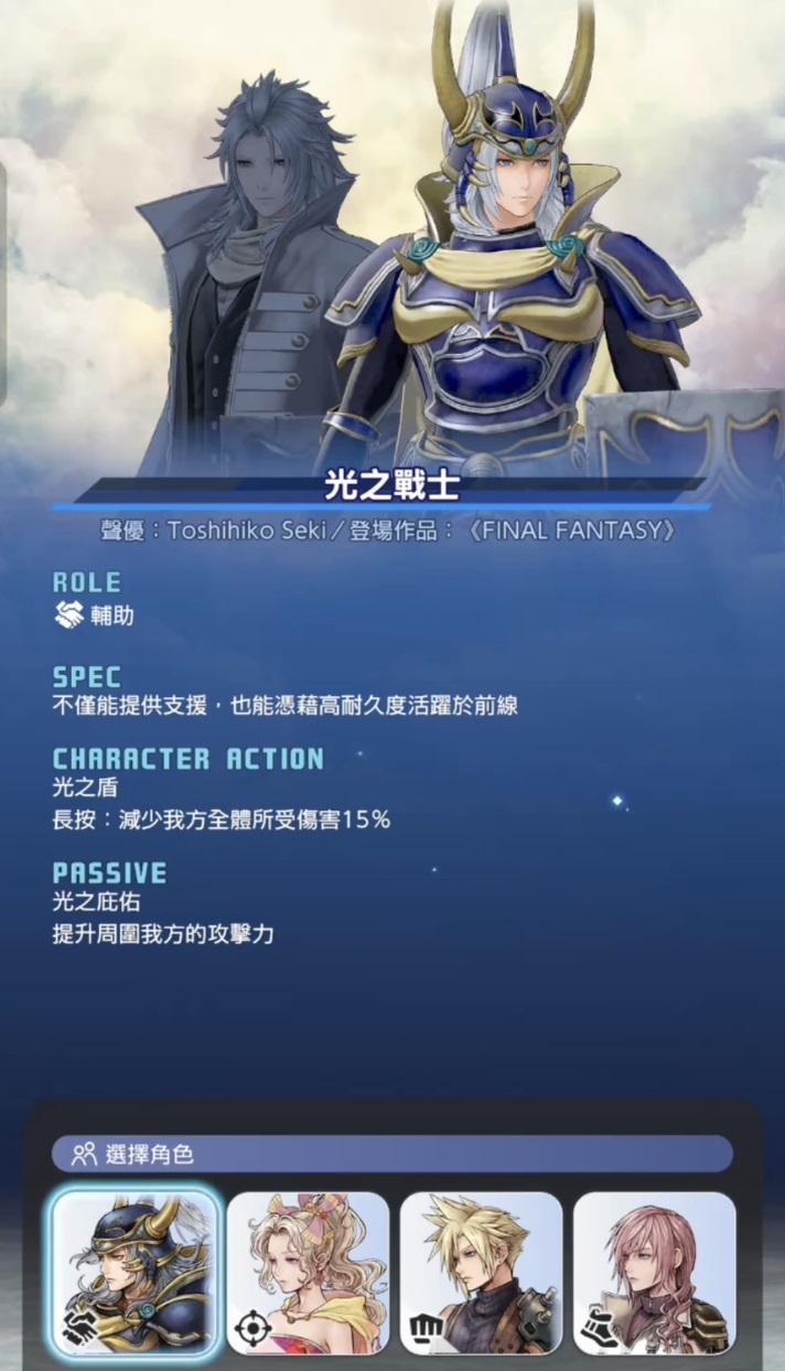 角色系统严格遵循《最终幻想》系列经典设定,共收录光之战士、萨菲罗斯等标志性人物,并按实战职能划分为重装、射击、敏捷、支援四大定位。每位角色均配备差异化技能树与专属武器成长路径,在3V3编队中需兼顾属性克制、技能衔接与站位协同,策略深度远超常规卡牌组合逻辑。对老粉丝而言,这是跨世代角色同台竞技的沉浸式情怀体验;对新玩家而言,则是低门槛进入高上限的战术养成入口。