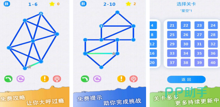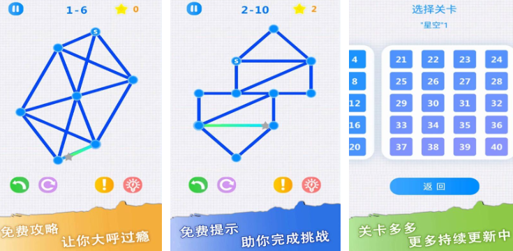 一笔画游戏中,游戏规则简洁明了,玩家只需在给定的图形中,从任意一点出发,通过一笔连续不间断地划过所有线条,且每条线都只能画一次,最终回到起点或者终点,即可完成关卡挑战,判断能否一笔画成的关键就是奇点的数量,奇点数量达标时图形就可以一笔画成,这一过程需要运用逻辑推理、空间想象、路径规划等多种思维能力,是对大脑的深度锻炼。