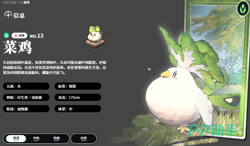 第五位是木属性奇波菜鸡,外形亲和但实战表现强势。其空中俯冲技能可对路径内所有敌人造成344%木属性伤害,并为目标附加“易伤”状态:受伤害提高1%,木属性抗性降低0.8%。补充技能为短距前冲,对前方扇形区域敌人造成79%木伤,兼顾补刀与战术位移。