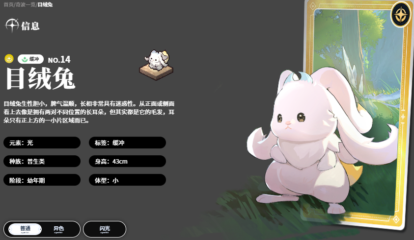 压轴登场的是光属性支援型奇波目绒兔。其核心价值在于团队生存强化:以自身最大生命值6.9%为基准,持续恢复范围内友方单位生命;若目标当前生命低于50%,治疗量额外提升20%。同时,该技能激活期间,自身及所有处于范围内的队友,将获得持续8秒的物理防御与魔法防御双重增益,是组队挑战高难副本不可或缺的辅助核心。